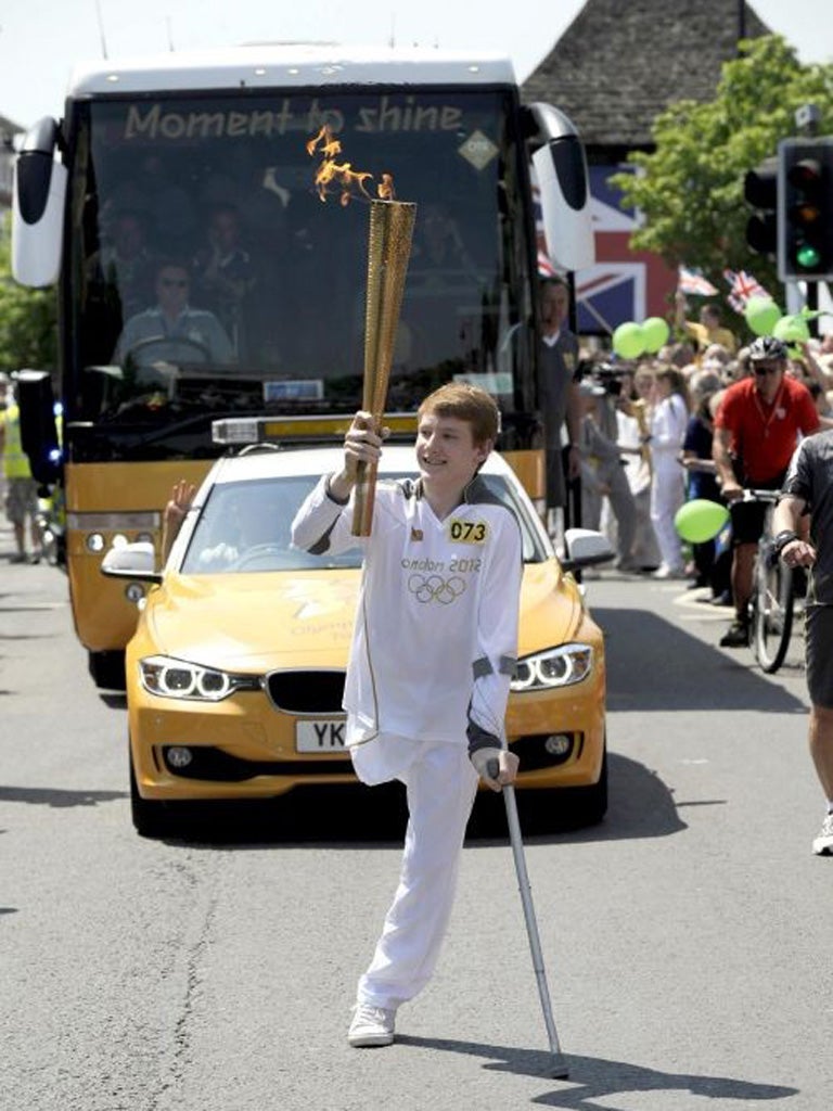 Ben Fox, 16, a wheelchair basketball player, is aiming to compete in the 2016 Olympics, but had an early taste of glory on Wednesday. The teenager, who was born with one leg, was adamant that he would not use a wheelchair and received wild cheers of support as he carried the torch through Royal Wootton Bassett using only a crutch.