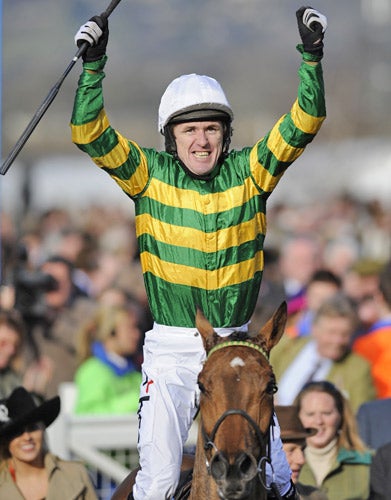 Yesterday, though, he was again the king of the valley. He had a brief conversation with his most formidable Cheltenham rival, Ruby Walsh, coming down the hill before the final push to the line. "I said to Ruby, 'How am I going?' and he replied that Khyber Kim was cantering behind but [I should] send Binocular on. It's hard to win at the Festival. I don't think in recent years I have had as torrid a time as everybody thinks. But winning this is everything. I think finally the real Binocular showed up. Today when I jumped two hurdles it was as though I was riding the horse for the first time, really riding.