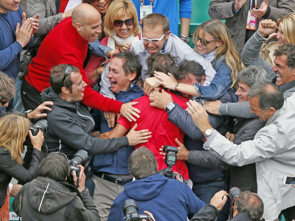 In his moment of victory, Nadal sank to his knees before looking up to his entourage with an expression that combined joy, incredulity and relief. Toni Nadal, his uncle and coach, leapt into the air before the champion climbed into the stands to hug every one of his party of coaches, family and friends.