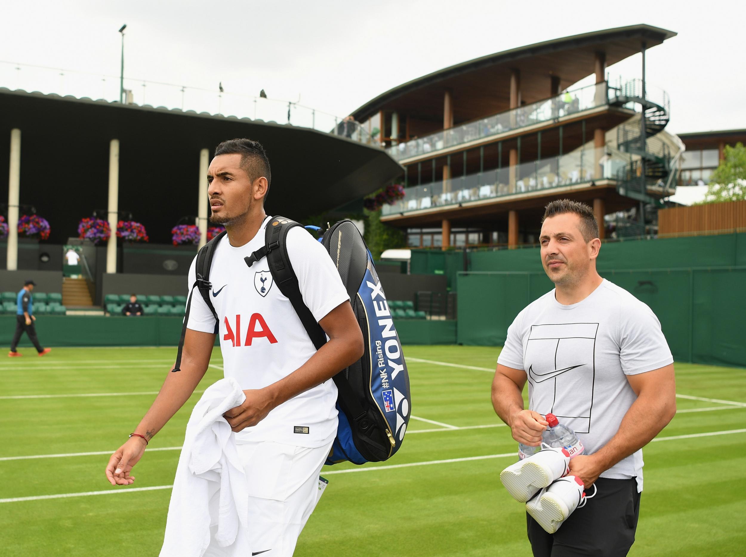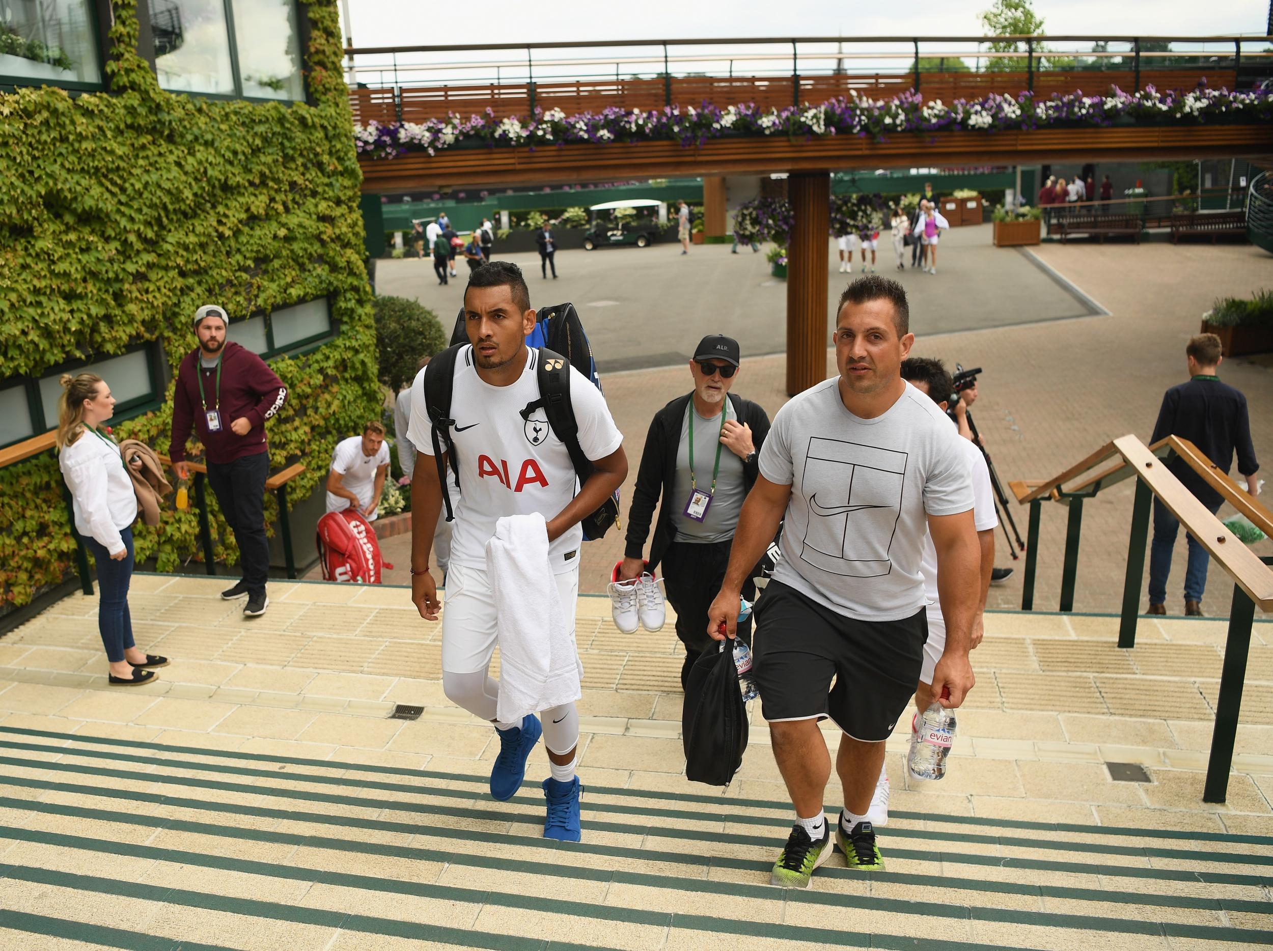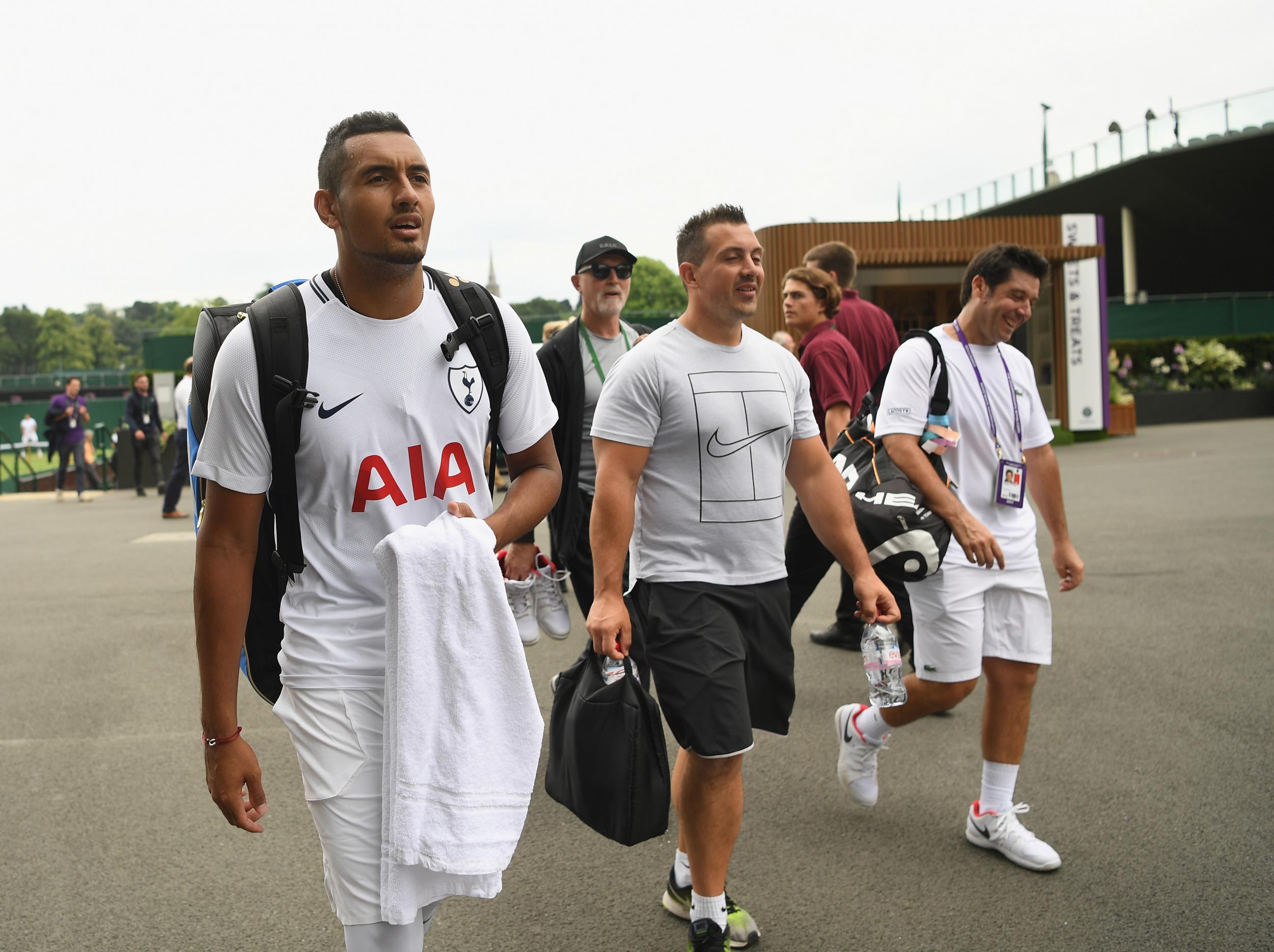 Kyrgios arrived for his Saturday practice session in Tottenham's new Nike shirt