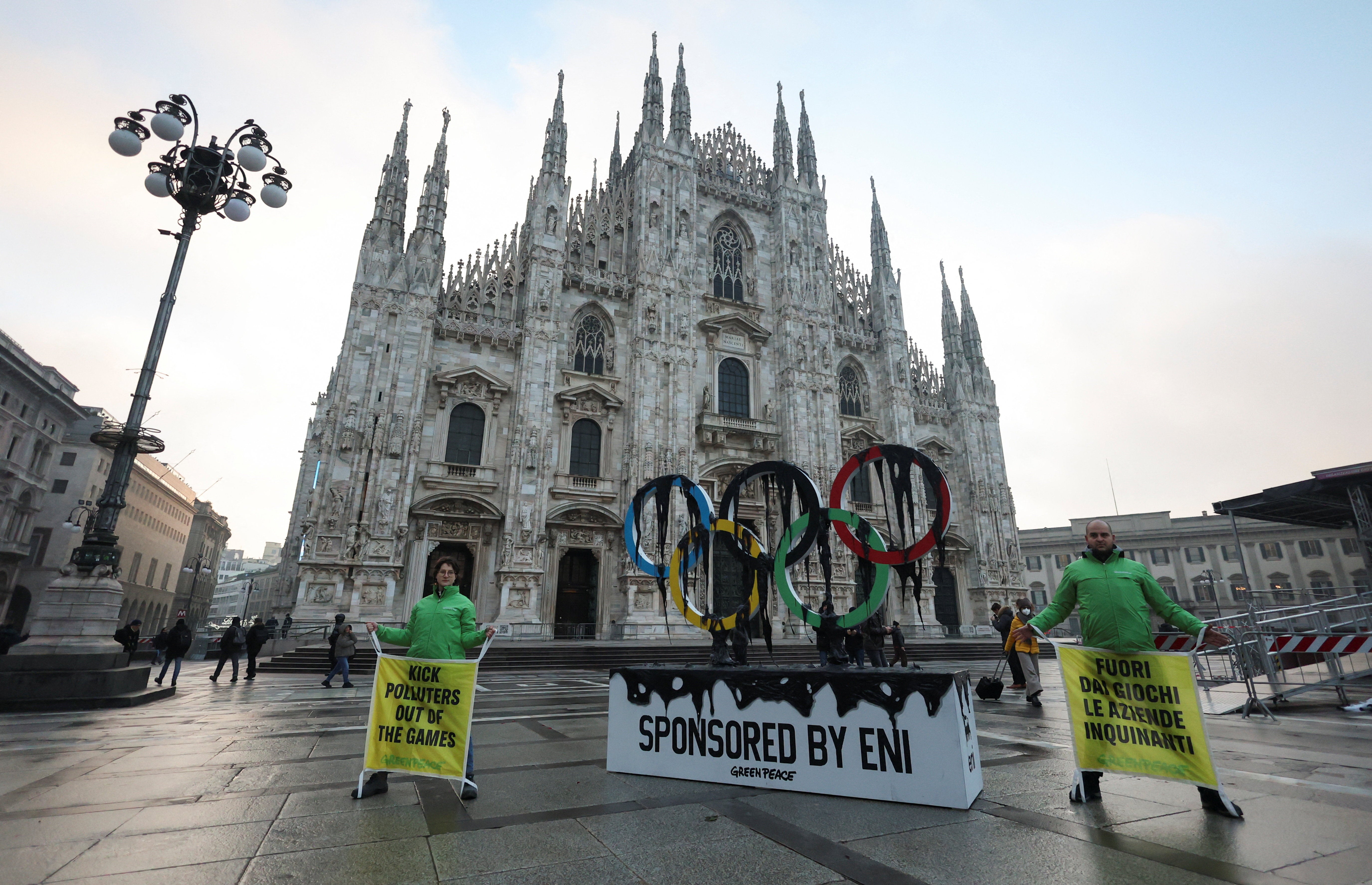 Environmental group Greenpeace staged a protest in front of Milan's Duomo cathedral on Thursday, as the Olympic torch arrived in the city co‑hosting the Winter Games.