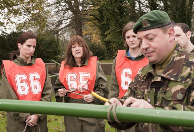 It's cold and muddy as we try to tie together two slippery planks and bridge a make-believe river. Lt-Col Mark Pomroy says that if we think this is tough, there is worse to come in the afternoon. "We've had people burst into tears, faint and even wet themselves under the pressure," he says helpfully.