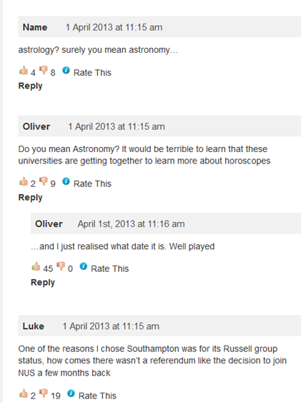 The independent student tabloid Soton Tab had a lot of success baiting Southampton University students in an article declaring that Southampton was abandoning the prestigious Russell Group in favour of a partnership with Greenwich, Reading, Aberystwyth, Newcastle and Nottingham Trent (or GRANTS), in which they would specialise in astrology, 'beginning with Uranus'.