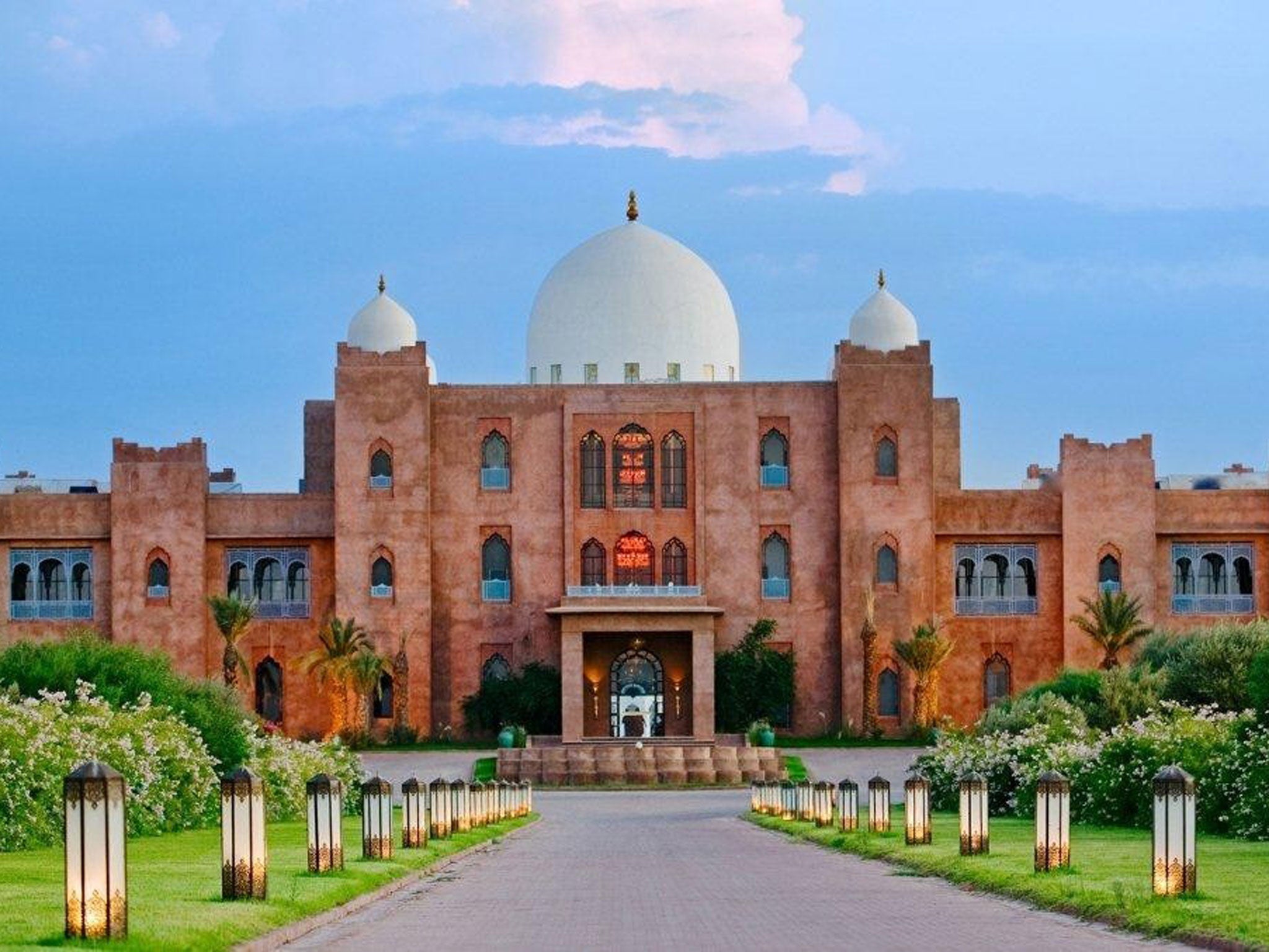 First impressions matter. And when the heavy wooden doors of the gatehouse swing open to reveal the 600m driveway to the Taj Palace, a low whistle seems the appropriate response. The extravagan avenue leads the eye to the white domes of the main building and on to the snow-capped Atlas mountains beyond – the impact of the hotel is scarcely less imposing than its namesake in Agra.