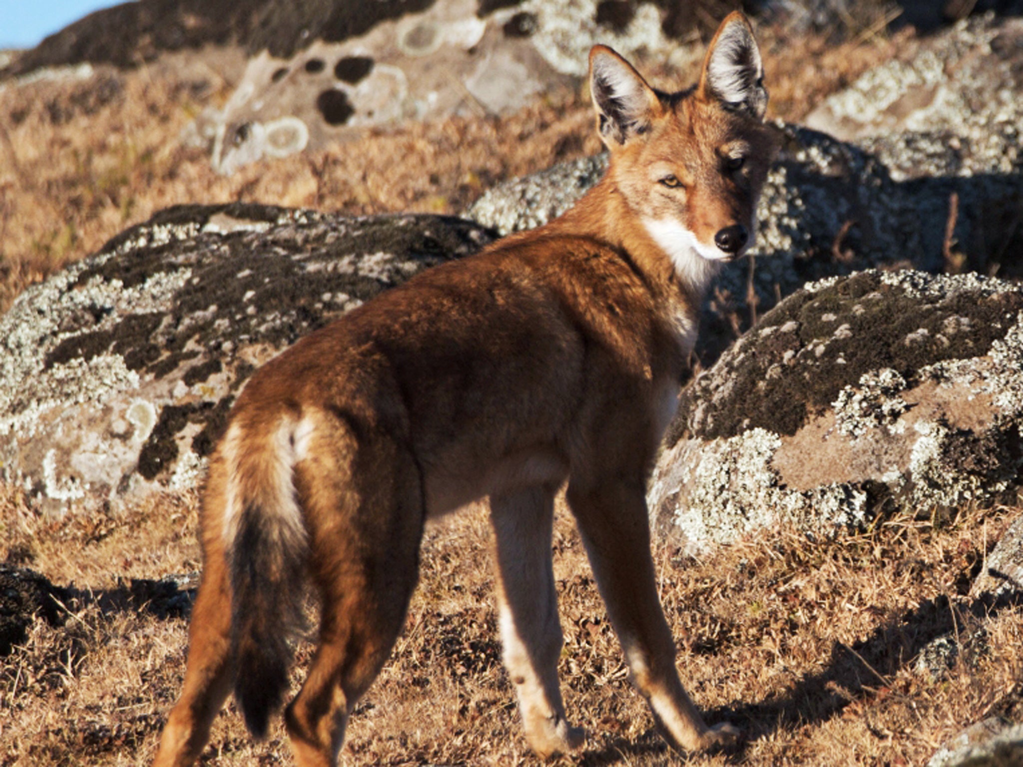 "Behind you, behind you!" In the distance a figure waved and shouted in earnest from atop the highest lava pinnacle in a field of humbling rocky erections. By his clothes I recognised our guide, Allu Hussein, though his message was lost to the wind. "Behind you! There's a wolf!" As I turned away from Allu's exaggerated pantomime of pointing and jumping, my gaze was indeed returned by the forward-facing binocular vision of one of the world's rarest hunters, about 100m away. An Ethiopian wolf, head hanging low, straining forward, scenting the air speculatively.