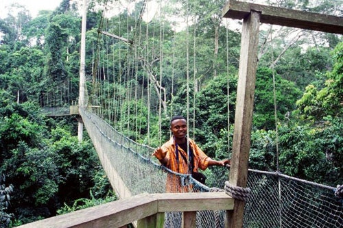 Moving further north, Kakum National Park has the only rainforest canopy walk in Africa, a rope bridge swinging 100ft above the ground and stretching for a nerve-jangling 300 yards across the tree tops.