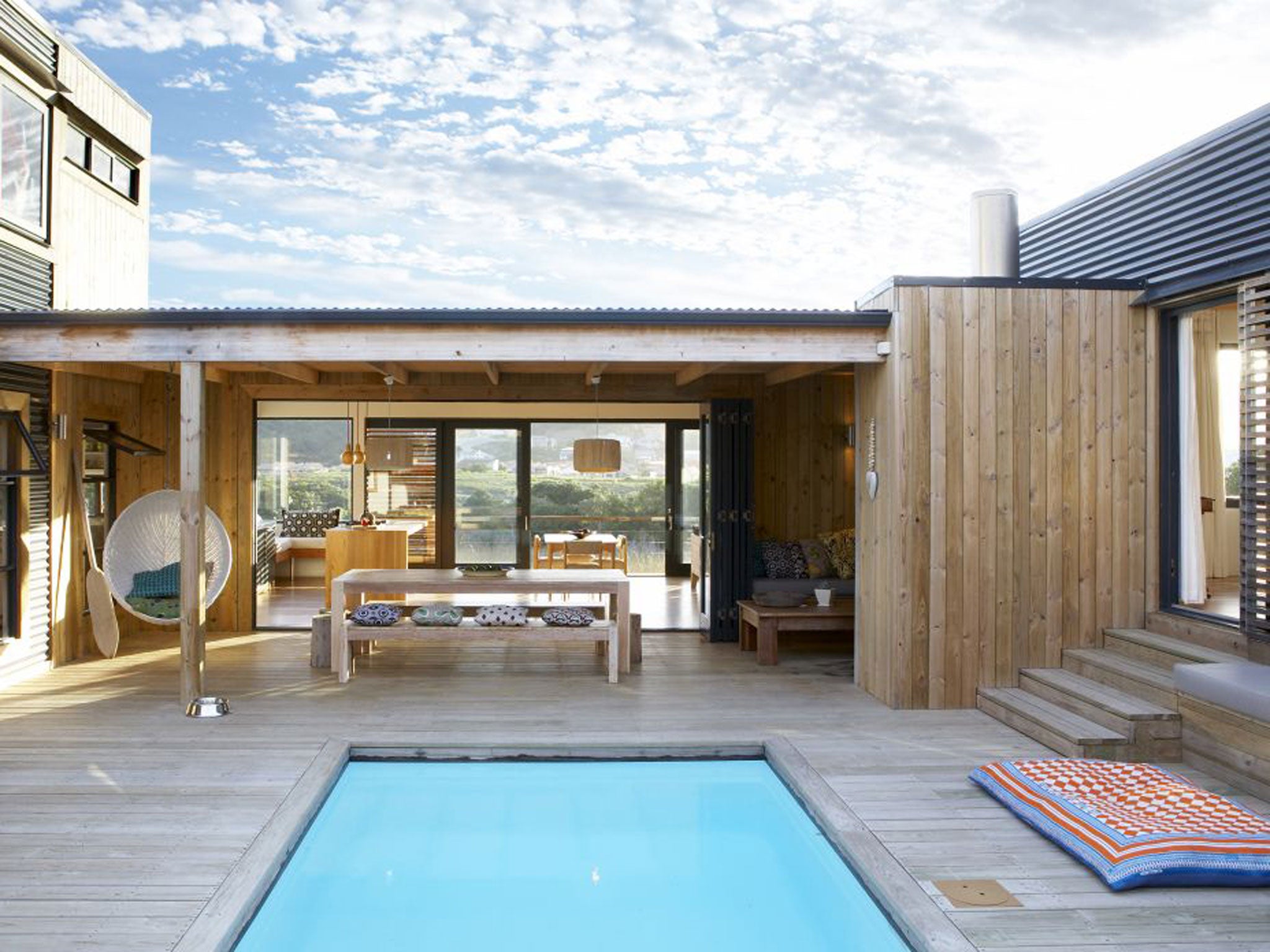 The wild coastal town of Wilderness is known as a top whale-watching spot. Here, you can stroll the shore for a close-up, or spot tail fins flicking from the sun deck of this four-bedroom villa. The outdoor space at Wilderness Haven is exceptional, with dining tables, a pool and sunbeds scattered around a series of wooden decks. Sliding doors channel the cool sea breeze inside, where the double-height reception room looks up to thick bamboo beams.