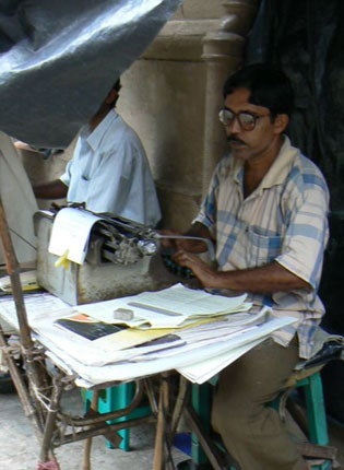 Eight o'clock on a Tuesday morning and already a dozen or so of Kolkata's legal clerks were hard at work. At their makeshift offices of tarpaulin and bamboo that fringe the exterior of the imposing 19th-century High Court, they were clattering away on sturdy manual typewriters, their multiple carbon copies clipped together with clothes pegs. India, the land of IT, was showing an endearingly antiquated face.