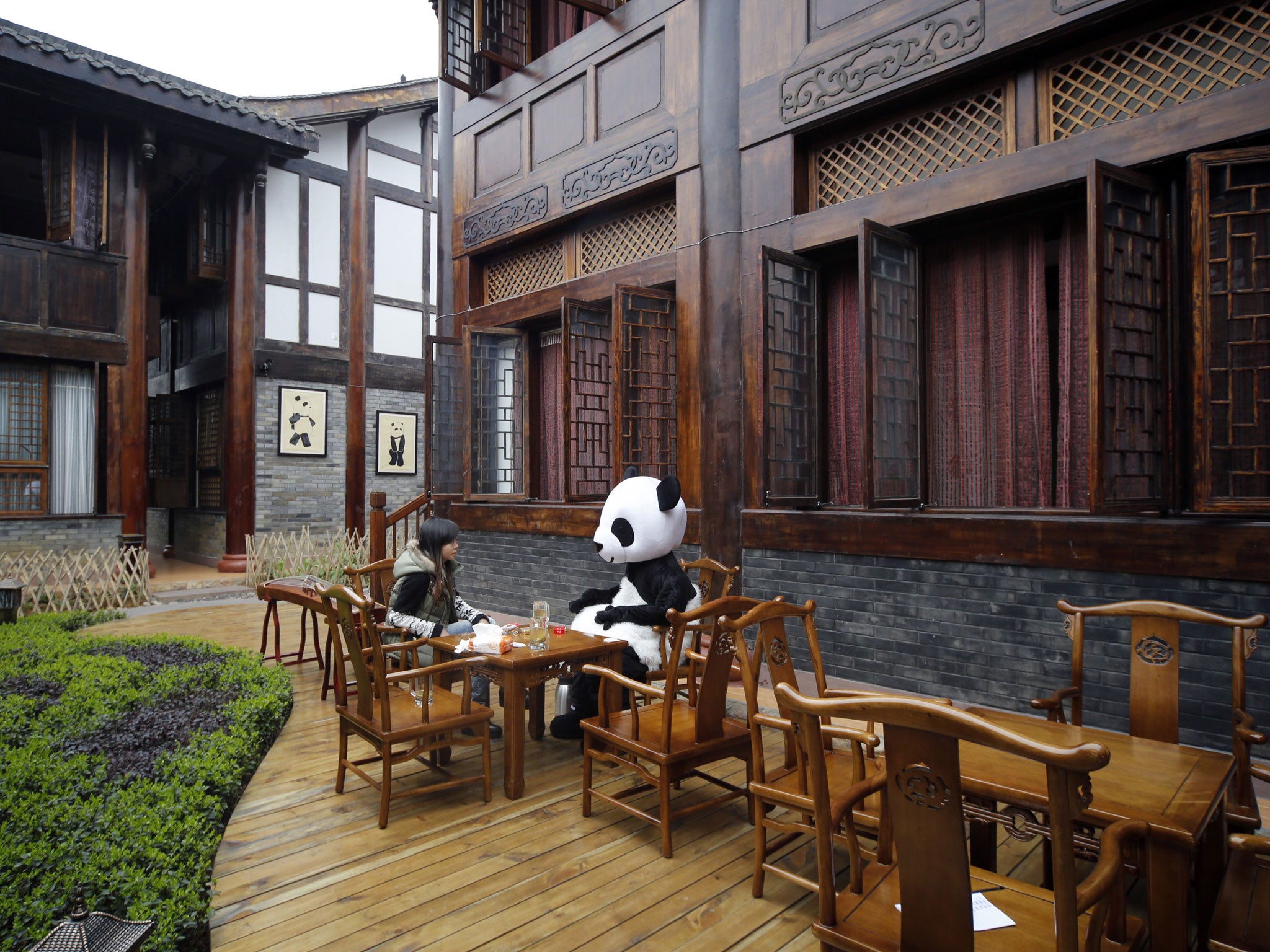 The rooms are decorated with panda pictures and cuddly toy pandas sit on the beds, tables and chairs. The staff even dress in panda costumes to entertain the guests.