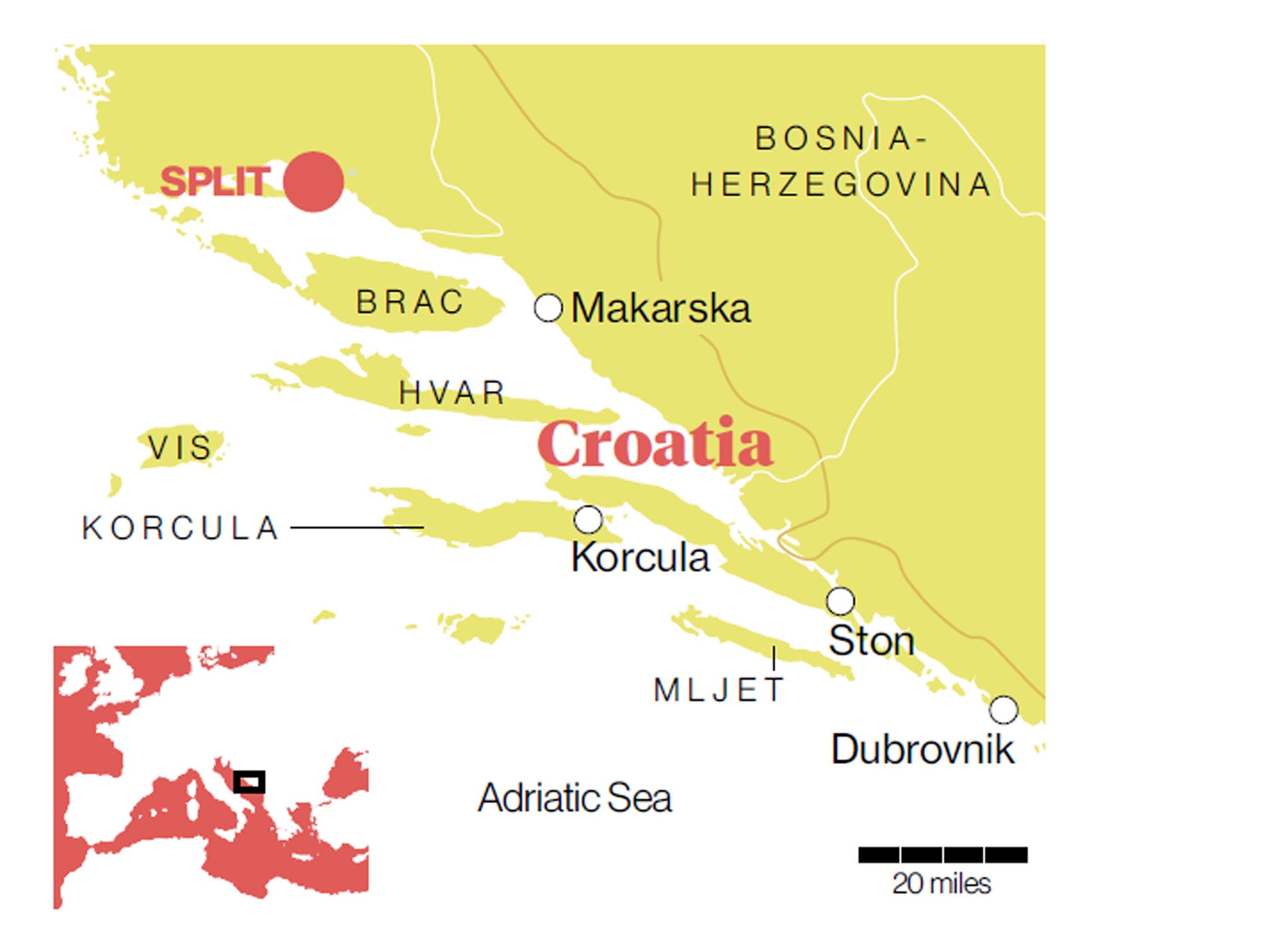 Despite its booming popularity and bewitching coastline, Croatia remains in places quaintly underdeveloped. In Lumbarda, a village at the eastern edge of Korcula, I asked a local if there were anything worth seeing other than the beach (a rare sandy one). She couldn't have been less enthusiastic, which would have been fine had she not been managing the tourist office. Previously, in Brac, we repaired from the heat to Vidova Gora, a rocky outcrop with wonderful views south and down to Zlatni Rat. Anywhere else, it would house cafés and gift shops. I arrived alone to find flies circling animal skins drying in the sun at a spooky farmhouse. Nervously sipping on a Coke, I asked the woman serving me who the skins had belonged to. "The wild pig," she replied, while scrubbing a plastic tub I imagined had been used to collect blood. "Yesterday, my boss, she shoot more than 100kg." I didn't hang around.