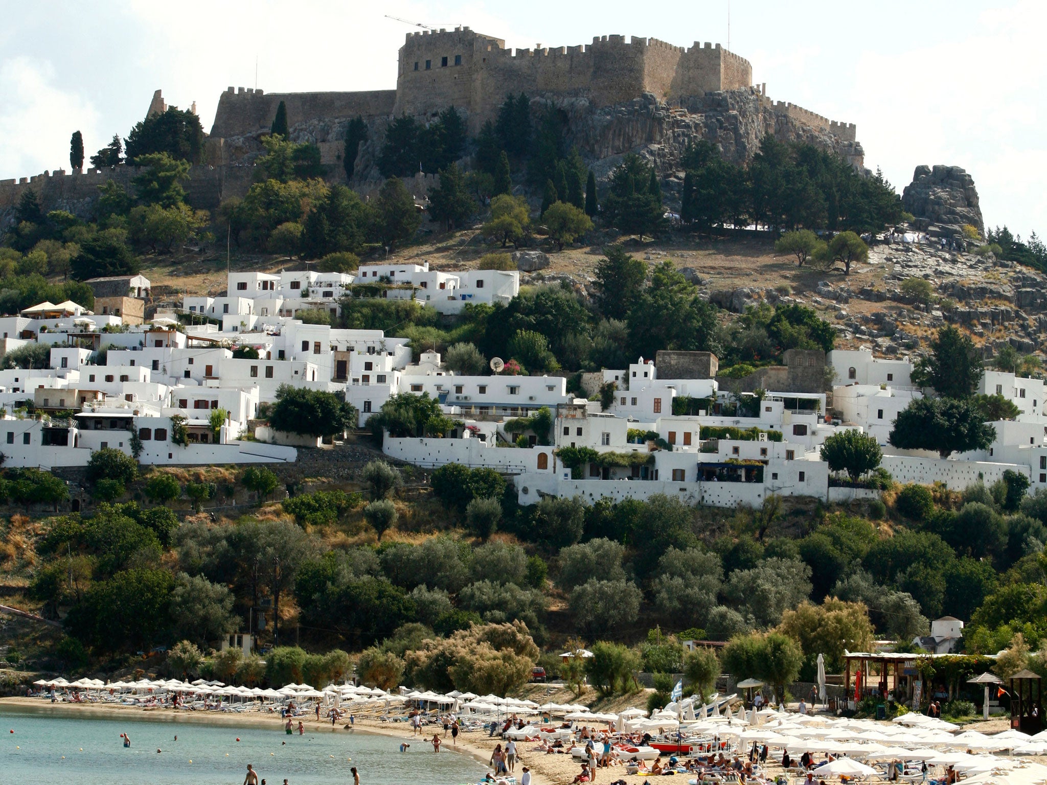 First, an impulse stop at a roadside taverna called Coralli in Pefkos, a suburb of Lindos. Smiling faces beckoned me in, revealing not just the restaurant, but also a large swimming pool bordered by sunbathers of various shades and sizes. Waiters balanced trays resplendent with terracotta bowls, filled with taramosalata pinks and hummus browns.