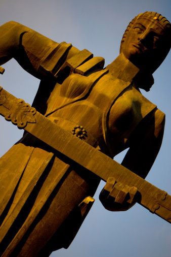 In Mother Armenia's right hand is a sword, lowered so it runs in front of her stomach. From a distance the silhouette of body and weapon forms a cross, apt for a country that was the first to adopt Christianity as its state religion. In front of the statue, written in the 1,700-year-old Armenian alphabet, are the words "We don't know your name, but your courage is immortal".