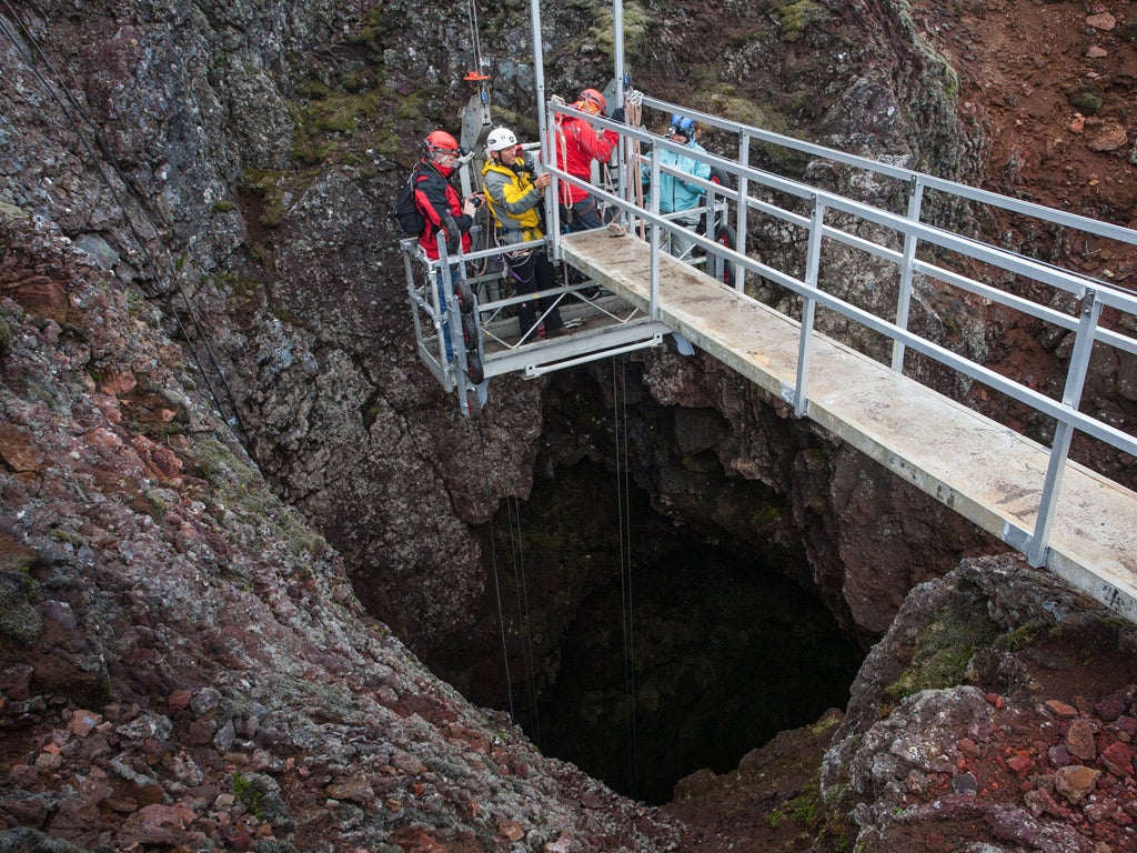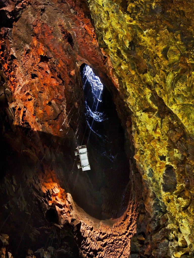 Thrihnukagigur's cone sticks 35m out from the surrounding landscape. At the top is a black hole, four metres square, a funnel-shaped opening that is the only way in and out of the volcano. Above the crater is a construction crane beam, which is laid across the opening of the crater and acts as a support for the lift mechanism and walking platform.