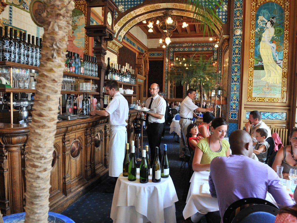 Leave the arcade and follow the pink line along Rue Crébillon to Place Graslin. Check out La Cigale (00 33 2 51 84 94 94; www.lacigale.com), a 19th-century restaurant with extravagant Art Nouveau interiors, which serves some of the freshest seafood in town – a good lunch stop. The main sight in this square is the 18th-century Théâtre Graslin, but its glorious façade of Corinthian columns, topped with statues of the muses, is currently obscured by scaffolding.