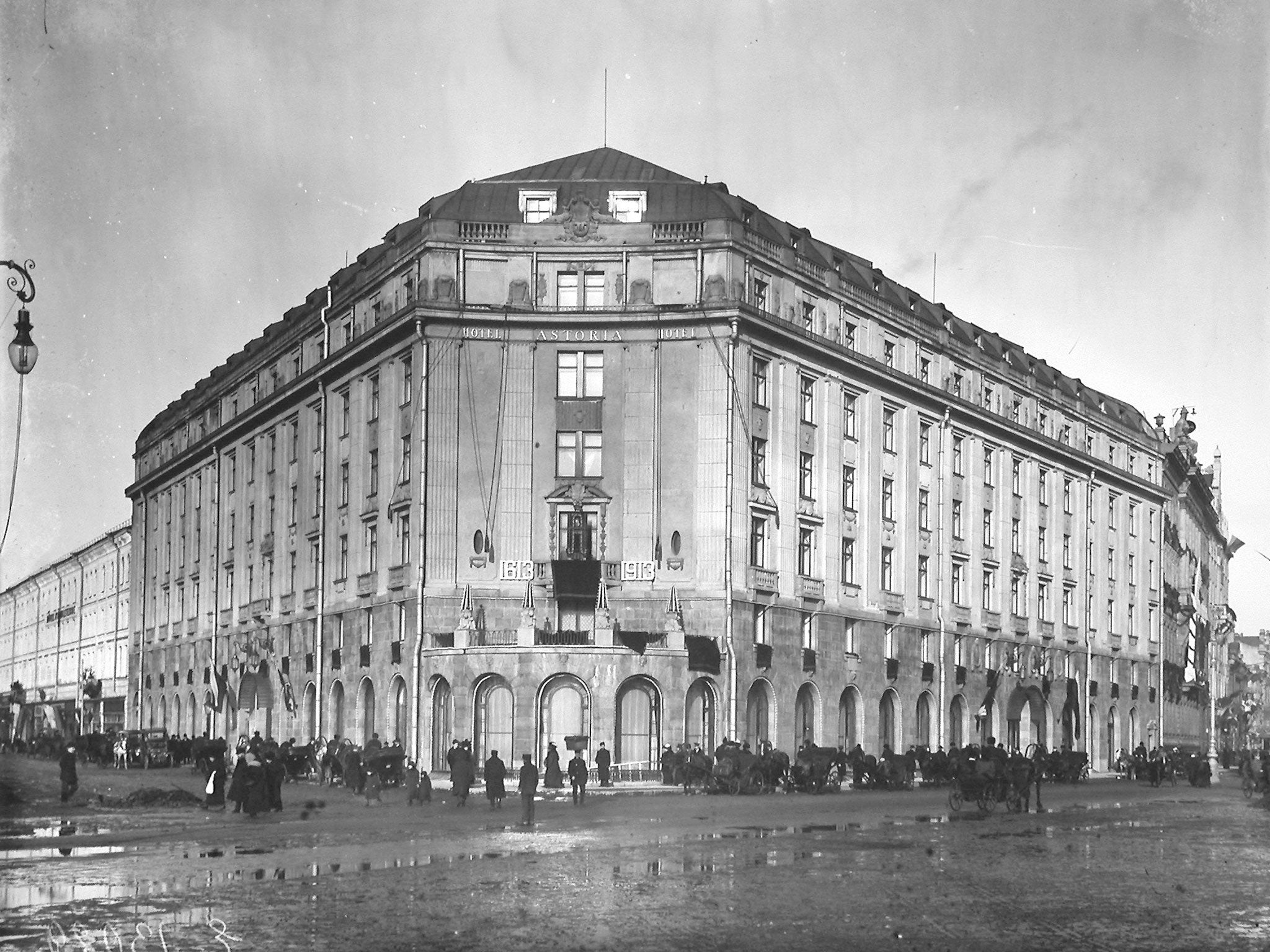 It was commissioned in 1910 in the hope that it would be ready for the tercentenary of the Romanov dynasty – but by the time the royal festivities took place in May 1913, the hotel had already found favour with St Petersburg society. Its opening on 23 December 1912 was enough of an event for the noted photographer Karl Bulla to capture the evening on film. A century on, his images still tell a story: unsmiling gentlemen, moustaches clipped, dress-coats smart; a pair of Orthodox priests staring at the camera, serious of expression.