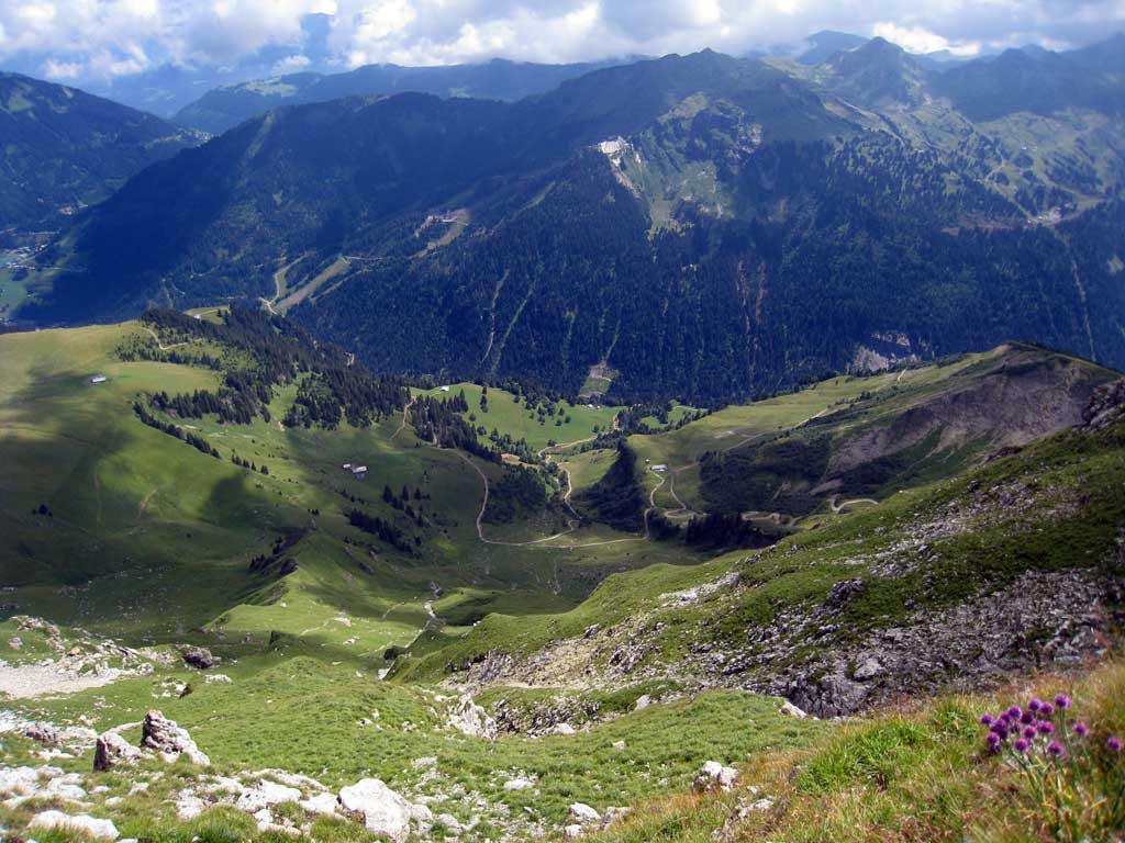 On leaving Hôtel Le Renard, recovered but still delicate, we once again took the chairlift, this time up to Le Morcelan, saving me 1,000 metres of climbing. It is wonderful to sweep up silently over the earth, like paragliding in reverse. At the top, we were almost alone – at 10am, on a Saturday, in August – in the midst of a magnificent panorama. Blue peaks surrounded us on all sides, some dark and brooding under a carapace of cloud. Beneath my feet, wild flowers once more lay in profusion, a patchwork quilt of colours flung across the mountainside. I cannot remember seeing them in such abundance anywhere else in Europe.