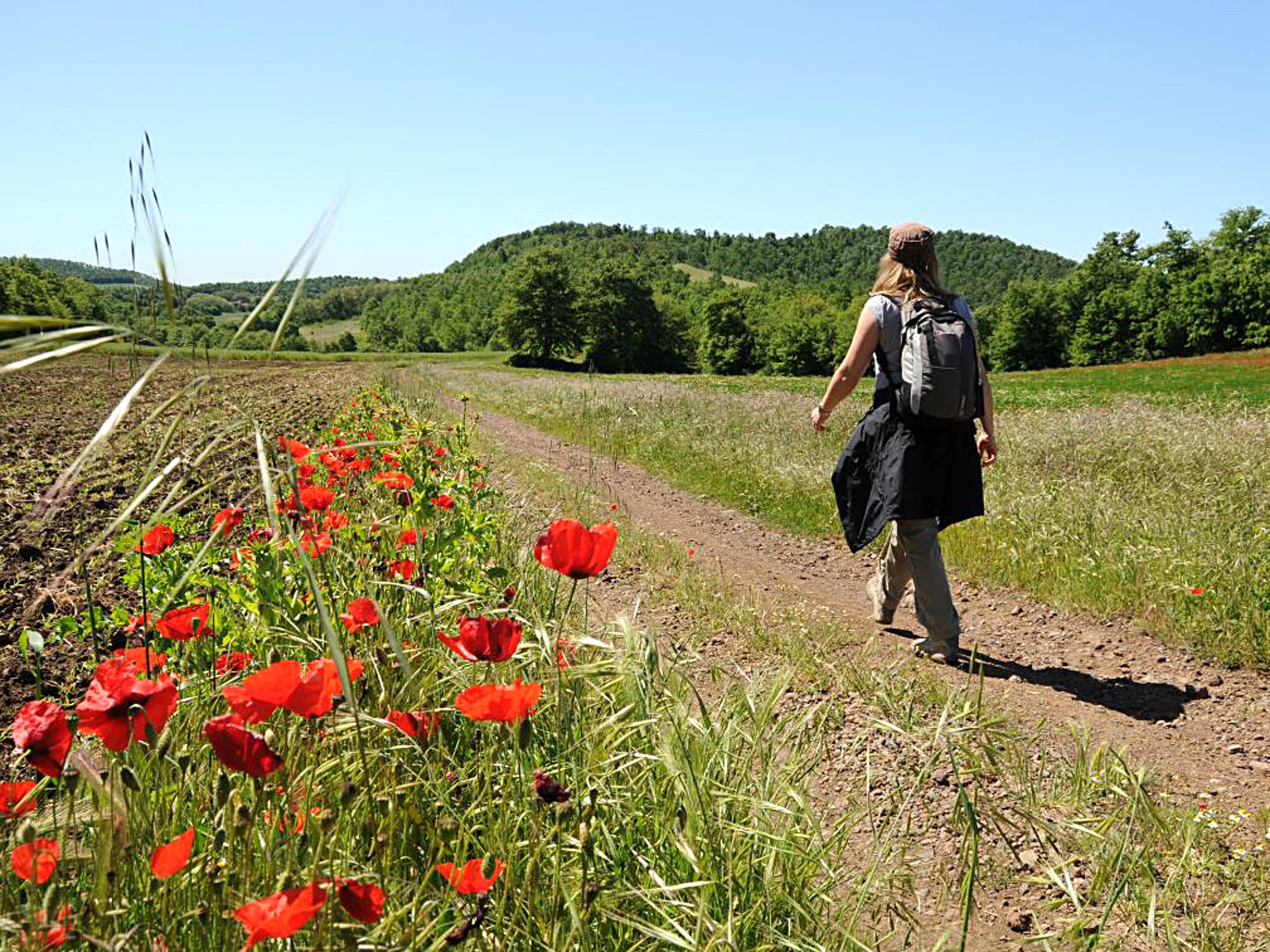 Serene views of the lake came with my dinner of buttery coregone freshwater fish at the Loriana Park Hotel, run by friendly sisters Antonella and Bianca. They gave me a substantial packed lunch for my next 16km stage to Montefiascone, a pretty medieval town on the edge of a volcanic crater. First I had a few climbs to reach a road overlooking the lake, where owners of large villas gave me serious garden envy with their enormous vegetable plots, vineyards and olive groves. As the path dipped in and out of woods, wild flowers were everywhere: tiny orchids, wild roses, broom, elderflower and yet more poppies. The scent was heavenly.