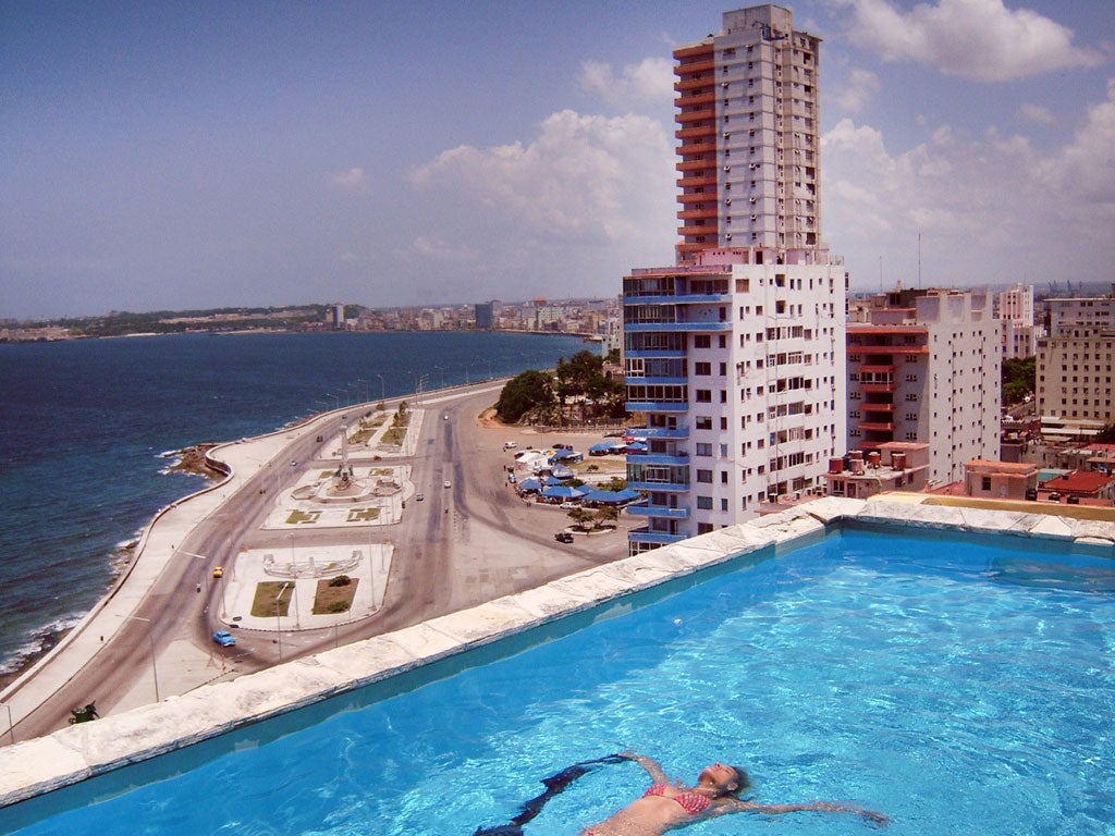 Habanavista straddles a sky-high penthouse and pool overlooking the Malecó*, Havana's serpentine seaside wall. At this height, the city looks like a children's playset with toy cars – classic US autos – motoring between the midnight blue Atlantic and the peeling pastels of oceanfront homes. Deliciously intriguing is the pelican's-eye view of the US Interests Section of the Swiss Embassy, a pseudo American mission. (The US and Cuba broke diplomatic relations in 1961.)