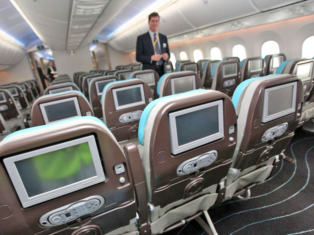 Airline executives and reporters were given a first look behind the window shades of the troubled liner – except that there were none; the fuselage is equipped with auto-dimming "smart glass" which can be turned dark or clear with the flick of a switch.