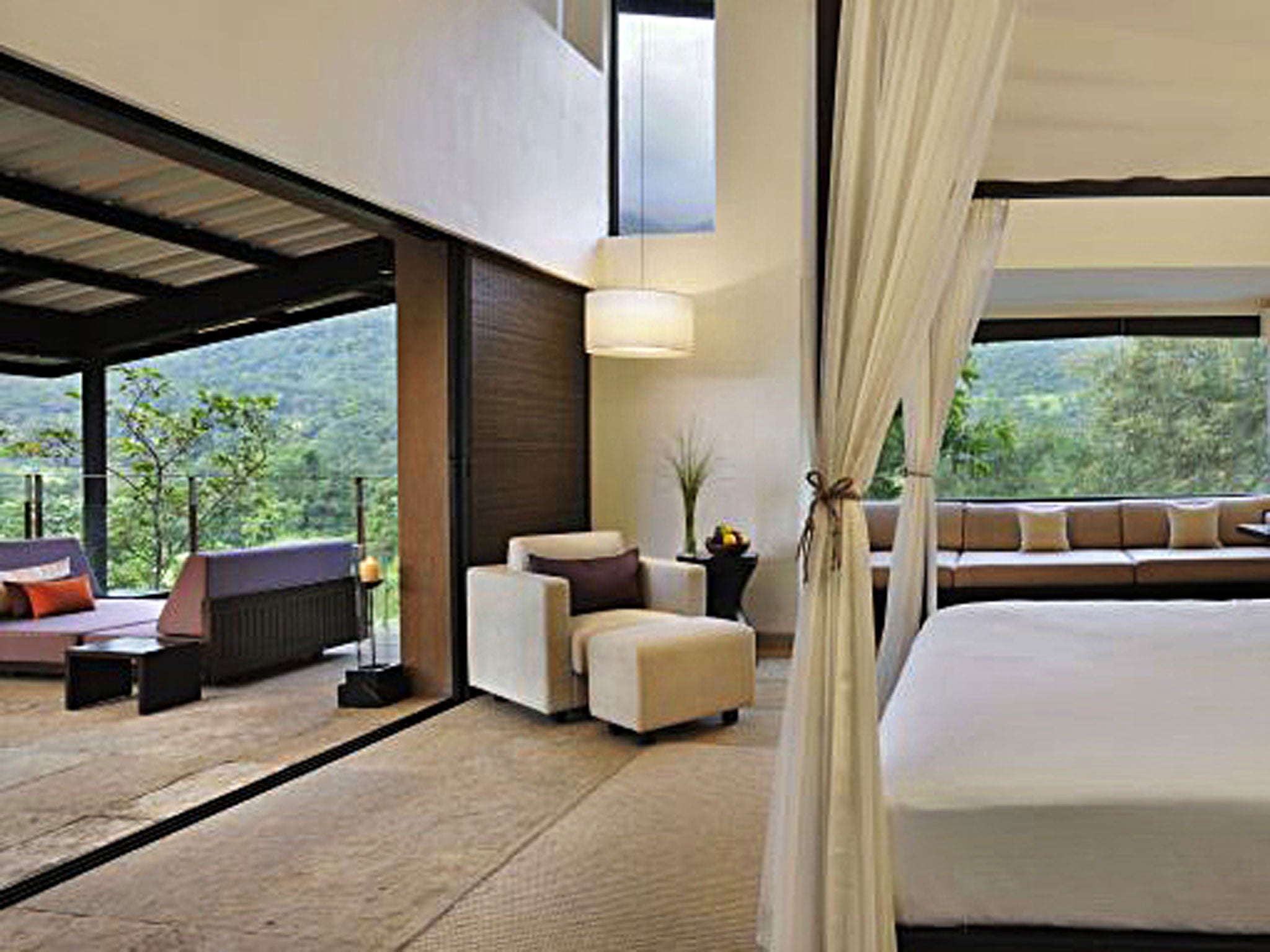 There are 99 spacious villas: Spa Pool Villas, Spa Villas, Forest View Villas and Valley View Villas. They all come with private decks or balconies, spa treatment areas and floor-to-ceiling windows. My Spa Pool Villa was a picture of exposed rough stone walls, polished stone floors, white ceilings and dark-wood furniture. Along with all the hi-tech kit – a 42-inch TV, iPod dock and espresso machine – the bed was four-poster, the living room's contemporary furniture was covered in tactile materials and billowing white curtains lined the windows. The sleek, grey slate bathroom's made-for-sharing bath and open shower looked out over a garden complete with loungers, an alfresco shower, and a heated pool where I tried out Watsu, a touchy-feely, water-based Shiatsu.