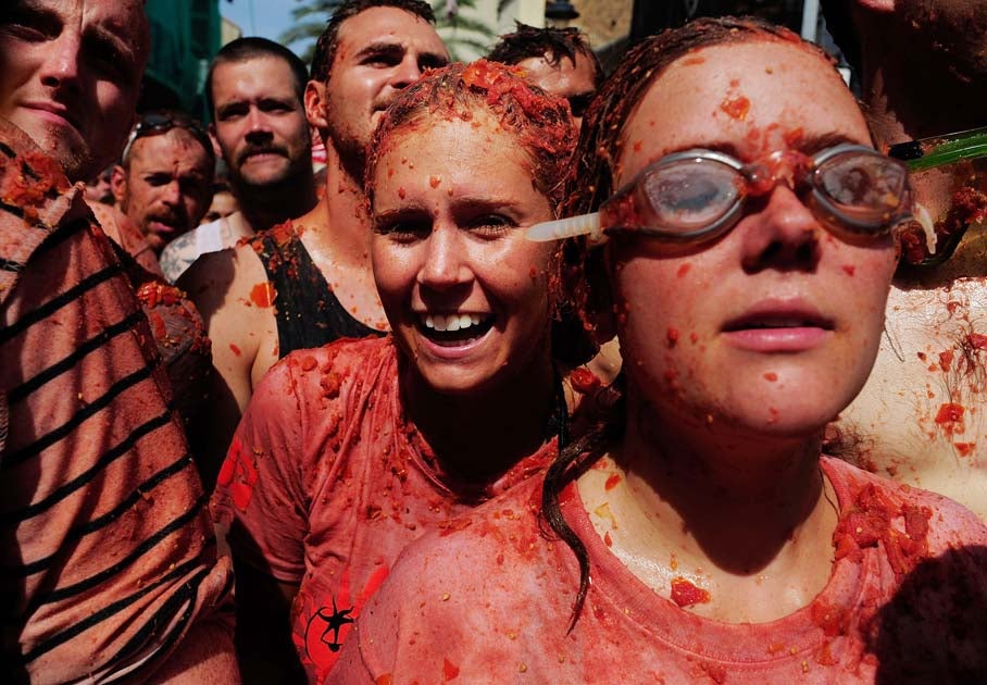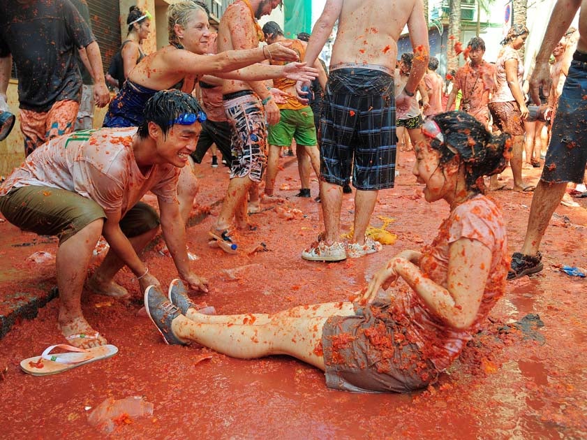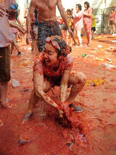 The streets ran red with slippery juice as nearly 40,000 people, many stripped to the waist and drunk with sangria, pelted each other in the Plaza Mayor square and nearby streets of Bunol, eastern Spain.