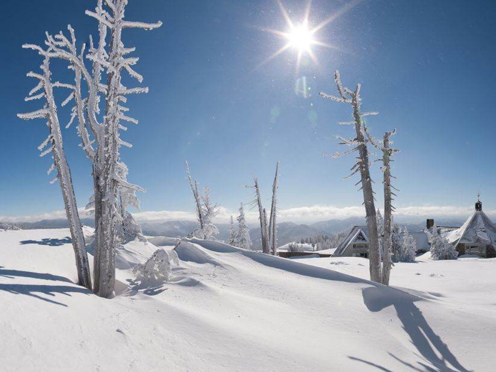 Meadows is the more rewarding, with varied terrain for all standards. Lifts fan out from the main lodge halfway up the mountain, accessing the relatively open slopes near the summit. Take skiers' right for the Vista Express, with its web of blues and greens, or skiers' left for Cascades and Heather Canyon, a choice of off-piste steeps into the valleys off Shooting Star Ridge. In the near total absence of competition, adventurous skiers and boarders can pick their lines, racking up the angle of descent as confidence grows. The lower part of the mountain is glade skiing, with rolling blue cruisers funnelling into the long Hood River Express chair.