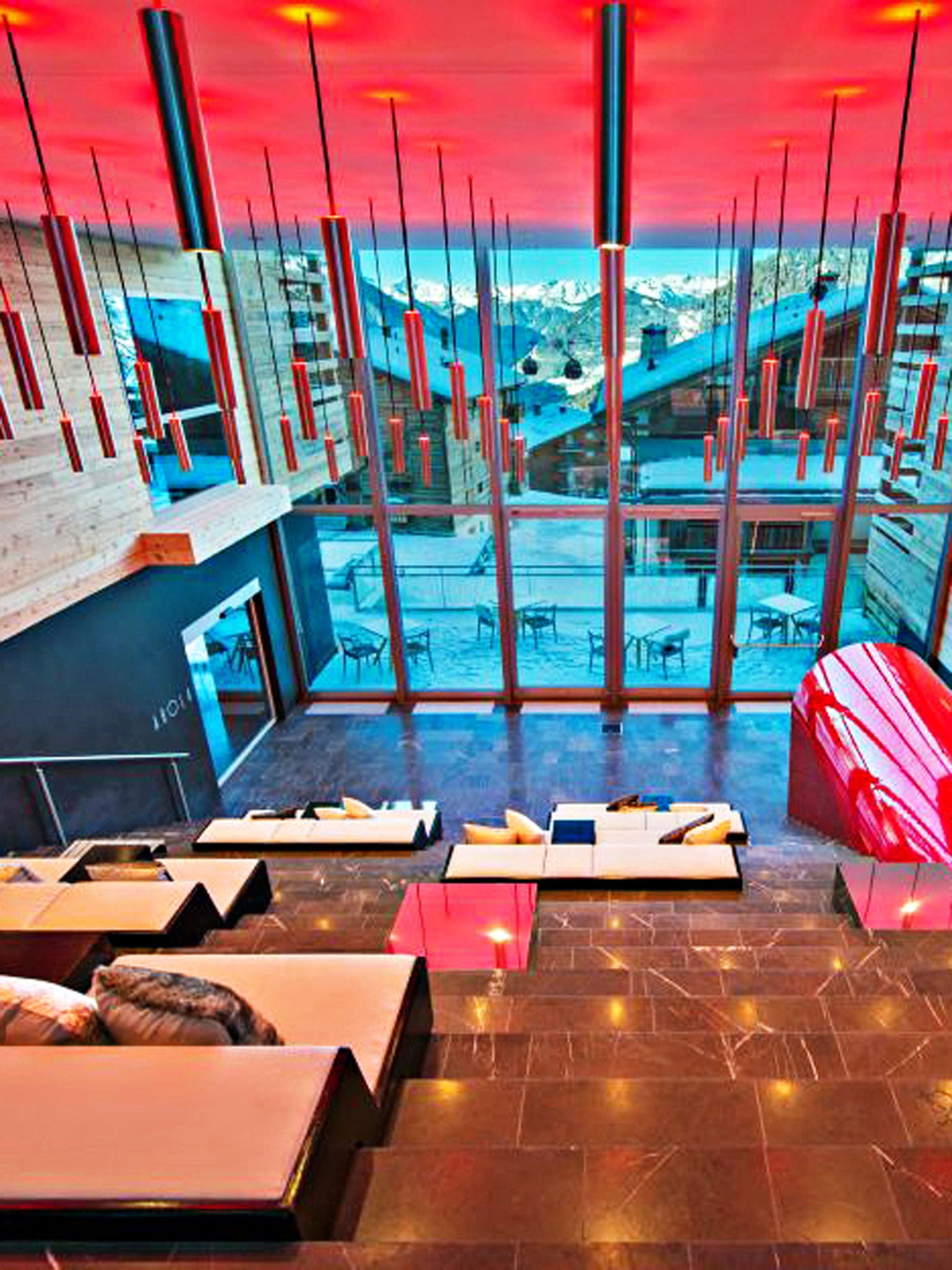 When I visited, the opening of the hotel was imminent (with the first guests eventually arriving at the beginning of December). Hard hats were labouring around the clock to bring essential polish to dusty concrete, while suits with clipboards introduced groups of beautiful lads and lasses to elite service. Top of the completion hit list: 105 smart red and grey bedrooms separated from spacious bathrooms by fires burning bio fuel. In some of the rooms, the showers offer valley snowscapes filtered through the flames.