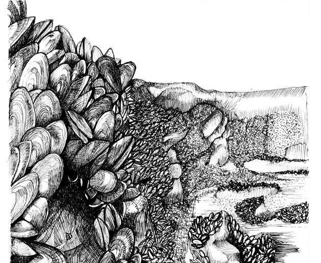 A few steps towards the sea and we felt the change; we were through the garden, out the back gate and down the path. With the sun brightening to the west, we followed it along the coast road and pulled the car over at any stretch of uninhabited rock or beach to search. Advancing down the shore in one spot we came across the first outposts of a colony, raked by sunlight. Commandeering the rock faces, they were wedged in their thousands on a curving trajectory up and down the shore, as if lava had flowed down from the sandstone cliffs and stuck to the stone. We twisted the best specimens free as gulls shrieked above.