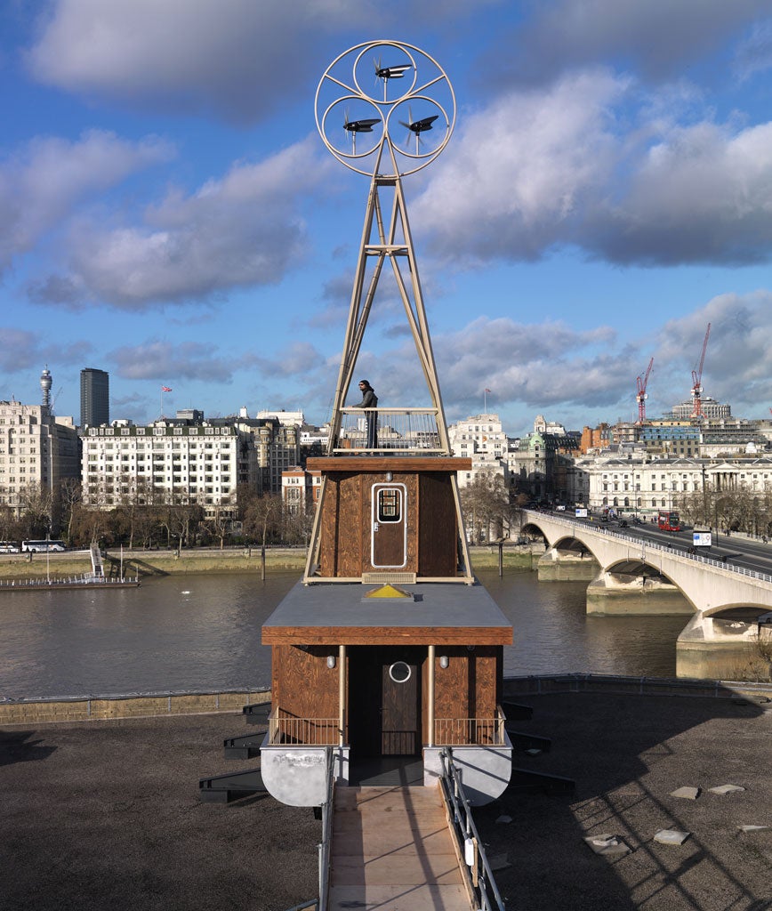 It's not really a boat at all. Le Roi des Belges was fabricated in three sections in a Brighton yard by an exhibition contractor and craned into place. Still, the illusion is impressive. You pass through a door into a saloon with heads on the left and galley on the right, secluded by concertina screens. This saloon is partitioned at its median and beyond it you find a double bed, itself stowable, facing the prow. A drop-down ladder allows access to a bridge, intended here as study space. And from this study another ladder leads to a hinged Perspex bubble. Above that, an openwork structure hosting at its summit three humming WTGs (wind turbine generators) that provide most of the power A Room for London needs.
