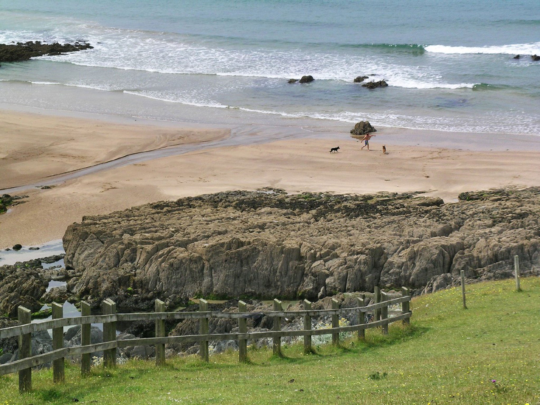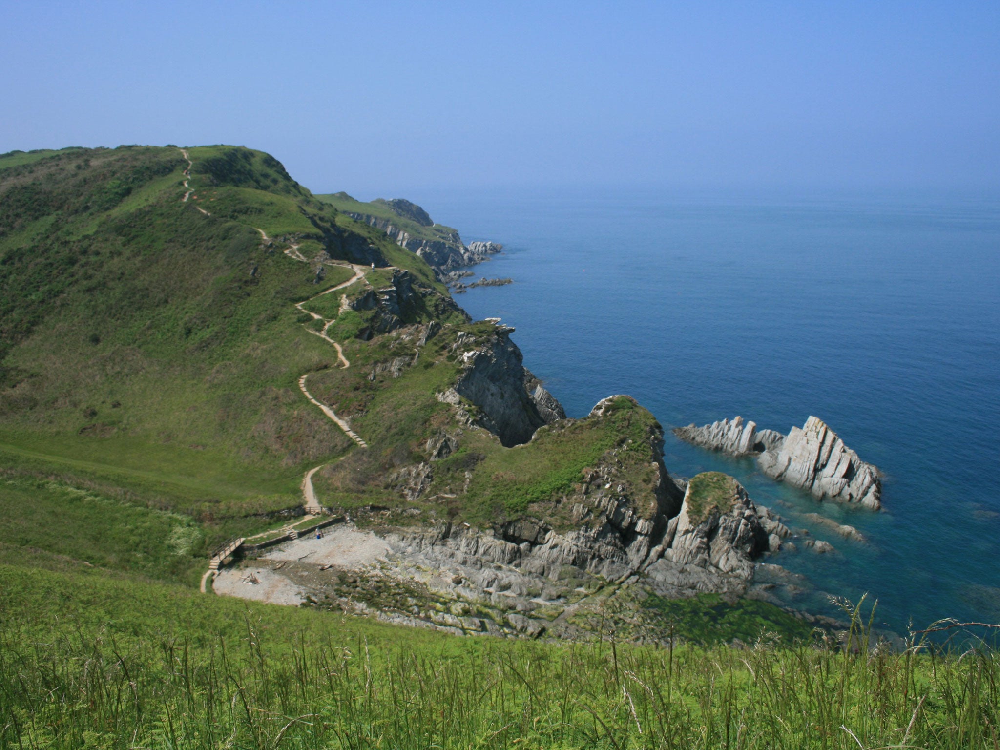There's a pleasing freshness to walking on Morte Point: the sheep-grazed lowland heath is like a billiard table and descends almost to sea level, while to my right rocky grey slates narrow to a beak-like point. Unexpectedly, the gorse is in blossom. Low tide has revealed smoothed rock columns that resemble an embryonic Giant's Causeway. To the south the landscape is stirringly graceful. Close by is Woolacombe Sand where a hardy band of surfers doggedly fights the swells. Then there's a gaping, heaving swathe of open sea. Beyond that stands Baggy Point and then, sitting on the horizon, Hartland Point, marking the gateway between the Bristol Channel and the Atlantic Ocean.