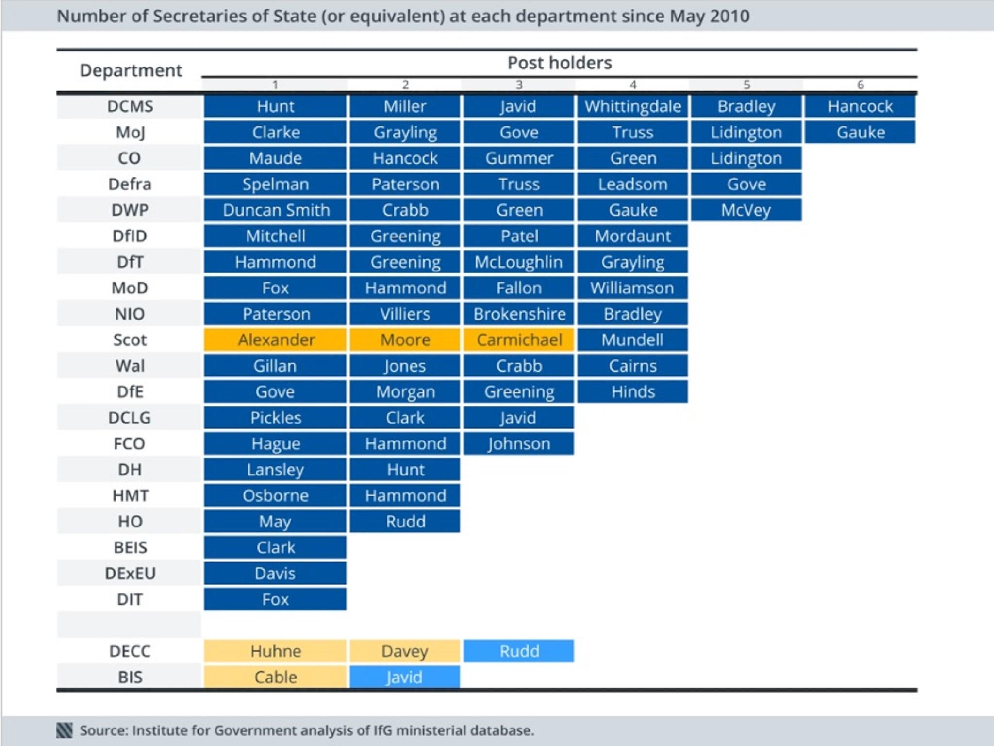 The Institute for Government report sets out the depressing picture of ministerial churn in its latest annual report on Whitehall. Since 2010 we have had six different justice secretaries and six culture secretaries. Over that time the minister in charge of the Department for Work and Pensions has changed five times.