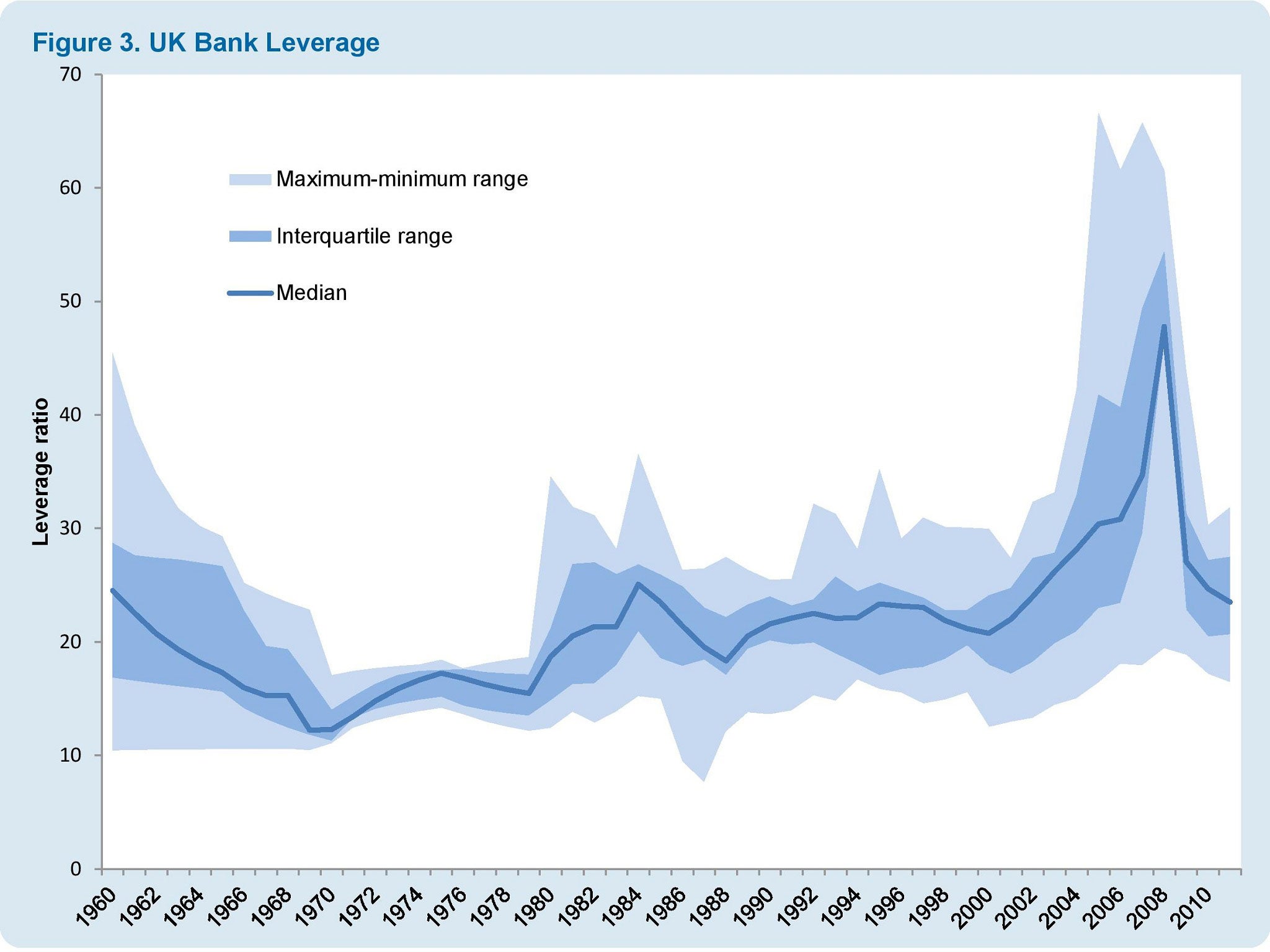 Chart 3 (above) shows ‘leverage’ in the UK banking system. Leverage is essentially the ratio of bank lending to its equity. You can think of bank equity as the cushion they can fall back on to absorb any losses on their lending. The larger the leverage, the more risk the bank is taking, and the lower its ability to absorb losses.